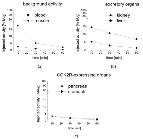Uptake values in selected tissues as obtained from metabolic biodistribution studies with [177Lu]Lu-1 in BALB/c mice at 10, 30 and 60 min p.i.: (a) background activity in blood and muscle, (b) excretory organs kidney and liver as well as (c) CCK2R-expressing pancreas and stomach. Values are expressed as % IA/g.