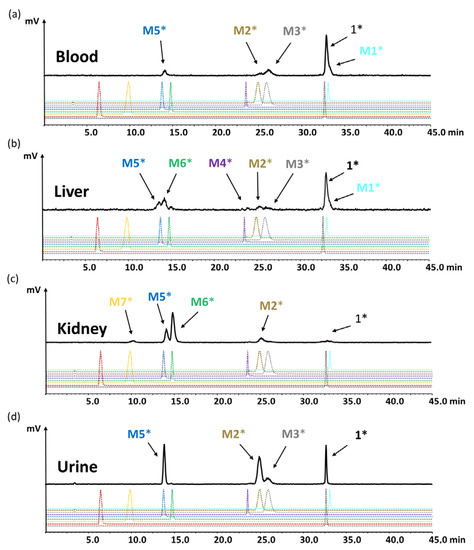 Radiochromatograms obtained from (a) blood, (c) liver, (d) kidneys and (b) urine of BALB/c mice injected with [177Lu]Lu-1 for the time point of 60 min p.i.; radiochromatograms of 177Lu-labeled peptides 1 and M1–M8 are shown for comparison (* indicating radiolabeled with lutetium-177).