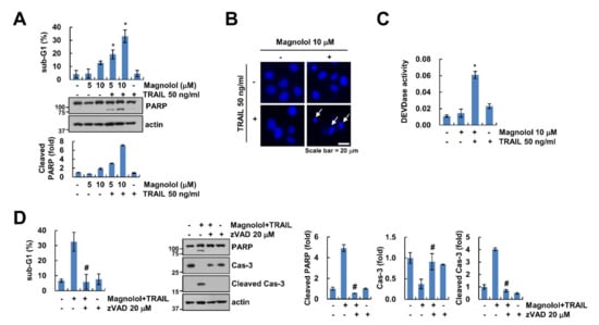 Figure 1. Magnolol induced TRAIL-mediated apoptosis. (A) Caki-1 cells were treated with 5–10 μM magnolol alone, 50 ng/mL TRAIL alone or magnolol plus TRAIL for 24 h. (B,C) Caki-1 cells were treated with 10 μM magnolol alone, 50 ng/mL TRAIL alone or magnolol plus TRAIL for 24 h. DAPI staining (B) and DEVDase (caspase-3) activity (C) were examined. (D) Caki-1 cells were treated with 10 μM magnolol plus 50 ng/mL TRAIL in the presence or absence of 20 μM z-VAD for 24 h. The sub-G1 population and protein expression were detected using flow cytometry (A,D) and Western blotting (A,D), respectively. The values in the graph (A,C,D) represent the mean ± SD of three independent experiments. * p < 0.01 compared to the control. # p < 0.01 compared to the combined treatment with magnolol and TRAIL. White arrows indicate nuclear chromatin condensation.