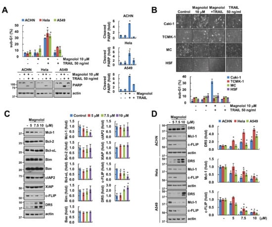 Figure 2. Effect of magnolol on TRAIL-induced apoptosis in other cancer and normal cells. (A,B) Indicated cancer (A) and normal cells (B) were treated with 10 μM magnolol alone, 50 ng/mL TRAIL alone or magnolol plus TRAIL for 24 h. (C,D) Caki-1 (C) and indicated cancer cells (D) were treated with various concentrations of magnolol for 24 h. The sub-G1 population and protein expression were detected using flow cytometry (A,B) and Western blotting (A,C,D), respectively. Cell morphology was examined using interference light microscopy (B). The values in graph (AD) represent the mean ± SD of three independent experiments. * p < 0.01 compared to the control.