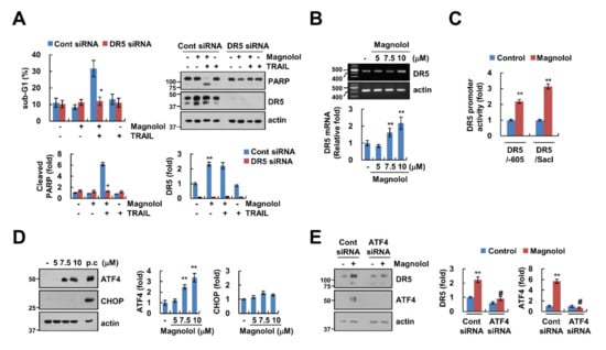Figure 3. ATF4-dependent DR5 upregulation by magnolol was involved in TRAIL-induced apoptosis. (A) Caki-1 cells were transfected with control (Cont) or DR5 siRNA and were treated with 10 μM magnolol alone, 50 ng/mL TRAIL alone or magnolol plus TRAIL for 24 h. (B) Caki-1 cells were treated with various concentrations of magnolol for 24 h. The levels of mRNA were examined using RT-PCR and quantitative PCR (qPCR). (C) Caki-1 cells were transiently transfected with DR5 (-605) or DR5 (SacI) promoter and incubated with 10 μM magnolol for 24 h. The cells were lysed, and the luciferase activity was measured as described in Materials and Methods. (D) Caki-1 cells were treated with various concentrations of magnolol for 9 h. (positive control (p.c); 2 μM brefeldin A). (E) Caki-1 cells were transfected with Cont or ATF4 siRNA and were treated with 10 μM magnolol for 9 h. The sub-G1 population and protein expression were detected using flow cytometry (A) and Western blotting (A,D,E), respectively. The values in graph (AE) represent the mean ± SD of three independent experiments. * p < 0.01 compared to the combined treatment with magnolol and TRAIL in control siRNA. ** p < 0.01 compared to control. # p < 0.01 compared to magnolol in control siRNA.