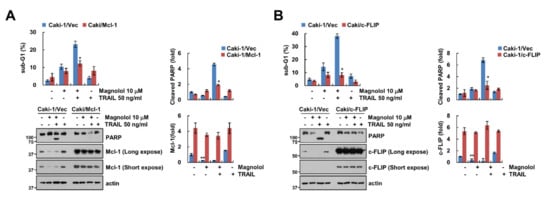 Figure 4. Overexpression of Mcl-1 and c-FLIP attenuated magnolol plus TRAIL-induced apoptosis. (A,B) Vector cells, Mcl-1- (A), and c-FLIP-overexpressing cells (B) were treated with 10 μM magnolol alone, 50 ng/mL TRAIL alone or magnolol plus TRAIL for 24 h. The sub-G1 population and protein expression were detected using flow cytometry and Western blotting, respectively (A,B). The values in graph (A,B) represent the mean ± SD of three independent samples. * p < 0.01 compared to combined treatment with magnolol and TRAIL in Caki-1/Vec. ** p < 0.01 compared to control.