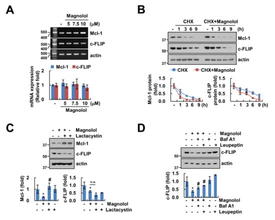 Figure 5. Magnolol induced downregulation of Mcl-1 and c-FLIP proteins at the post-translational level. (A) Caki-1 cells were treated with various concentrations of magnolol for 24 h. mRNA expression was detected using RT-PCR and qPCR. (B) Caki-1 cells were treated with 10 μM magnolol in the presence or absence of 20 μM CHX for the indicated time kinetics. Band intensity was quantified using Image J. (C,D) Caki-1 cells were treated with 10 μM magnolol in the presence or absence of 2.5 μM lactacystin (C), 5 nM bafilomycin A (Baf A1) (D), and 10 μM leupeptin (D) for 24 h. Protein expression was detected using Western blotting (BD). The values in graph (AD) represent the mean ± SD of three independent experiments. * p < 0.01 compared to the control. # p < 0.01 compared to magnolol. n.s. = no significant.