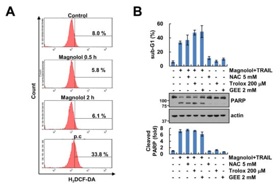 Figure 6. Involvement of ROS in magnolol plus TRAIL-induced apoptosis. (A) Caki-1 cells were treated with 10 μM magnolol for 0.5 and 2 h. Thioridazine was used as positive control (p.c). Caki-1 cells were stained with H2DCF-DA dye. Fluorescence was detected using flow cytometry. (B) Caki-1 cells were treated with 10 μM magnolol plus 50 ng/mL TRAIL in the presence or absence of 5 mM NAC, 200 μM trolox or 2 mM GEE for 24 h. The sub-G1 population and PARP cleavage were detected using flow cytometry and Western blotting, respectively. The values in graph (B) represent the mean ± SD of three independent samples.