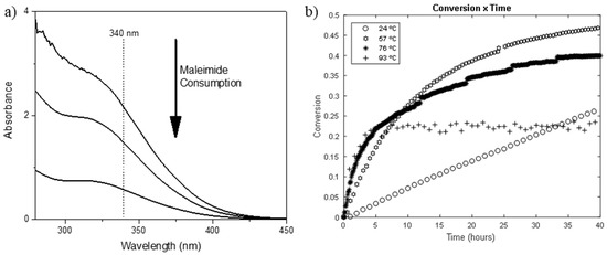 Maleimide disappearance over time could be followed by means of UV-Vis spectroscopy. From this data, estimation of product formation was done by considering the absence of any side reaction. Another important limitation of the methodology used in the UV-Vis interpretation is that we considered that the maleimide was the only component absorbing at a wavelength of 340 nm, selected for the data treatment. A similar approach was reported by Gandini et al. [22] when evaluating the polycondensation of furan–maleimide monomers. The authors attribute the observed decrease in absorbance to the loss of conjugation between the carbonyl groups and the unsaturation present in the maleimides.
