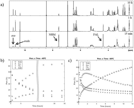 (a) Proton NMR spectra of the furfuryl alcohol/N-Hydroxymaleimide (FAL–NHM) reaction at different times and at 60 °C; (b) Percentage (%) versus time (hours) of FAL–NHM reaction at 40 °C; (c) Conversion (%) versus time (hours) of FAL–NHM reaction at 80 °C.