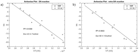 This equation can now be used in an Arrhenius Plot (lnk versus 1/T), where the value of the slope of the fitted line is equal to the activation energy. Figure 3a shows the fitting, the value of the activation energy, and the coefficient of determination for the forward FAL–NHM reaction. Figure 3b shows the same features for the retro-Diels–Alder reaction. In the graphs, calculated values from both techniques (UV-Vis and 1H NMR) are plotted together.