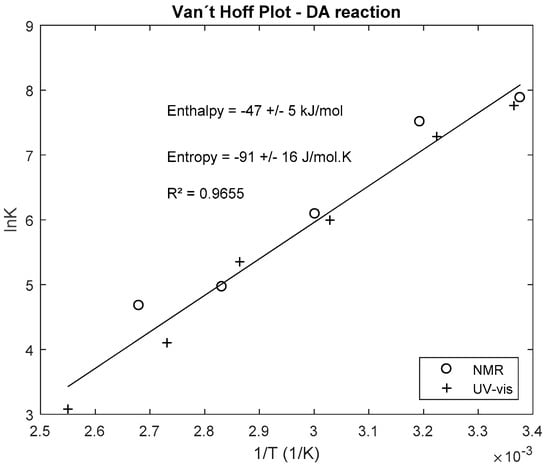 A model considering several reactions in parallel would have best represented the reacting system that we proposed to study. However, it would have complicated the prediction and required a greater amount of experiments. Due to that, the use of a simplified equilibrium reaction was selected. As is discussed later, the equilibrium selected does not completely eliminate all the issues, but it offers a reliable and replicable approach. In terms of estimation of the material behavior, the information obtained by the techniques selected are highly valuable. The use of two techniques that considerably differed in the initial concentration highlighted that that concentration should also be considered for the application of the Diels–Alder in a material. For example, in the UV-Vis experiment, the equilibrium conversion of the FAL–NHM adduct was about 40% at 76 °C, while in the 1H NMR experiment, the conversion was over 70% at 80 °C. Thinking again about a suspension of reacting particles, with the hypothesis that the reaction kinetic is the limiting factor for the conversion, 1H NMR and UV-Vis become complementary techniques, as they offer the estimation of the conversion in a broad concentration range. All the above information is useful for establishing the initial conditions for the material analysis. The kinetic and thermodynamic parameters of the reaction are summarized below. A focus on the importance of the methodology selected for that is discussed, and a suggested approach for the data treatment is presented.