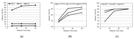 The radiochemical yields of 99mTc-N2S2 as a function of (a) ethylenediaminetetraacetic acid (EDTA) or glucoheptonate (GH) (pH = 7.5, Zn-N2S2: 1.0 × 10−5 M, EDTA: 1.5 × 10−4 M, GH: 1.5 × 10−4 M); (b) EDTA concentration (pH = 7.5, Zn-N2S2: 1.0 × 10−5 M); (c) reaction pH (Zn-N2S2: 1.0 × 10−5 M, EDTA: 1.5 × 10−4 M).