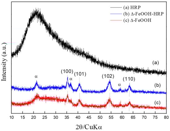 X-ray diffraction (XRD): (a) horseradish peroxidase (HRP); (b) Δ-FeOOH–HRP; (c) Δ-FeOOH particles.