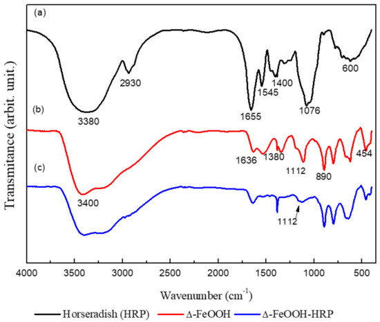 Fourier transform infrared spectroscopy (FTIR) spectra: (a) horseradish peroxidase (HRP); (b) Δ-FeOOH particles; and (c) Δ-FeOOH–HRP.