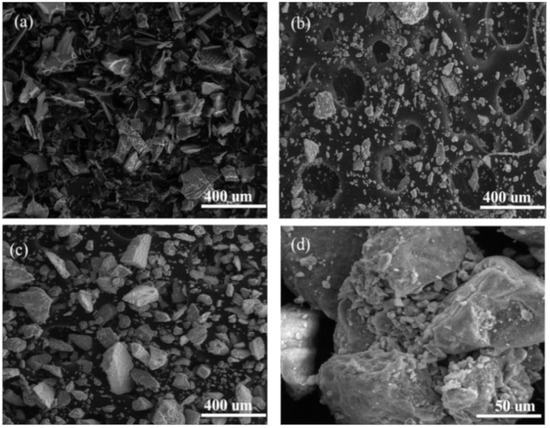 Scanning electron microscopy (SEM) image: (a) horseradish peroxidase (HRP); (b) Δ-FeOOH particles; and (c,d) Δ-FeOOH–HRP.