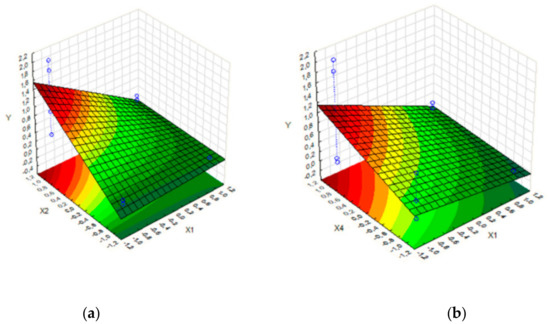 Response surface of factorial design: (a) variable X1 vs. X2; (b) variable X1 vs. X4.