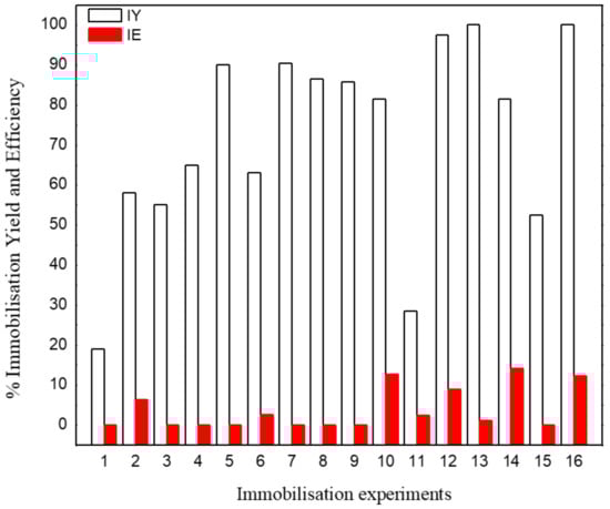 Immobilization yield (IY) and immobilization efficiency (IE): pH 4.0 (odd-number experiments), pH 8.0 (even-number experiments), and temperature 25 °C (experiments 1 until 8) and 60 °C (experiments 9 until 16).