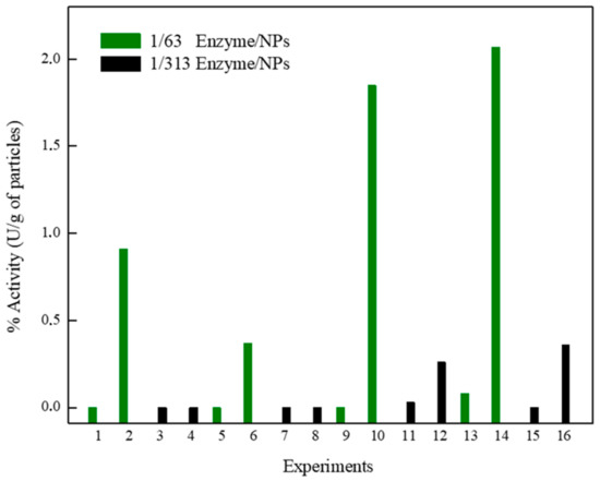 Assessing the immobilization yield, using a lower enzyme dose (1/313 enzyme/NPs at pH 8.0), the highest IY percentage (with the exception in pH 4.0 at 60 °C) was observed, indicating that the excess of enzymes may result in agglomerations on the surface of the support and affect the immobilization process. Already, processes conducted with pH 4.0, at 60 °C, and a lower enzyme dose (experiments 11 and 15) resulted in the lowest IY (29% and 52%, respectively) when compared with a more significant enzyme dose (experiments 9 and 13), which presented 86% and 100% of IY, respectively (Figure 5). However, the enzyme immobilized in these conditions (experiments 9 and 13) has not exhibited catalytically active (Figure 6). This is attributed to the inaccessible substrate to the surface or pores of the support with higher enzyme layers [11]. Also, the effect of the lowest pH can decrease the three-dimensional structure stability of the enzyme. HRP immobilized in the processes (2, 6, 10, and 14) involving the higher dose enzyme (1/63 enzyme/NPs) and pH 8.0 presented catalytic activity, displaying better activity when obtained at 60 °C than at 25 °C.