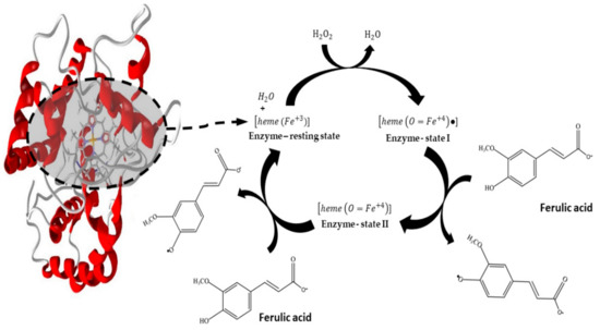 The peroxidase catalytic mechanism (Figure 7) responsible for FA oxidation includes the transfer of electrons. The first state of the modified enzyme (I) occurs from the reaction between H2O2 and the Fe+3 resting state, comprising Fe+4 and porphyrin radical cation. The enzyme stage (I) has two oxidation equivalents above the resting state. Then, the modified enzyme oxidizes the ferulic acid, resulting in another modified enzyme state (II), a Fe+4 no radical porphyrin cation. The ferulic acid oxidation in the two reduction steps leads to the radical species generation. These radicals are exceedingly reactive; therefore, the oxidized molecules product of this reaction reacts to each other, resulting in dimers, trimers, oligomers, and polymers [5,10,16], which can be separated by the simple process of sedimentation.