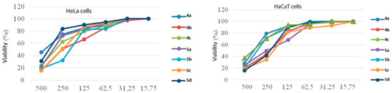 The cytotoxicity of compounds 4a–c, 5a–d on HeLa and HaCaT cells (evaluation at 48 h, using CellTiter 96® AQueous One Solution Cell Proliferation).