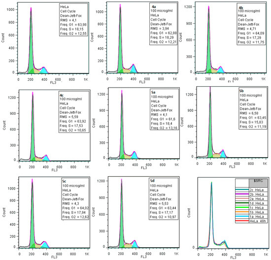 Flow cytometry histograms showing the influence of compounds 4a–c, 5a–d on the cellular cycle of HeLa and HaCaT cells. Y axis—intensity of fluorescence; X axis—the relative number of cells (15,000 events were investigated).