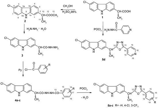 Starting from carprofen we also obtained (RS)-1-(6-chloro-9H-carbazol-2-yl)-1-[5-(4-pyridyl)-1,3,4-oxadiazol-2-yl]ethane (5d) by reaction with isoniazid, in the presence of phosphorus oxychloride.