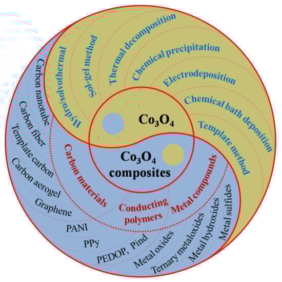 In this review, recent progress on Co3O4 and Co3O4-containing composites is summarized. Firstly, the synthetic methods and electrochemical performance of Co3O4 electrode materials are introduced, including the hydrothermal/solvothermal method, sol–gel method, thermal decomposition, chemical precipitation, electrodeposition, chemical bath deposition, and the template method. Then, Co3O4-containing electrode materials are summarized, including Co3O4/carbon, Co3O4/conducting polymer, and Co3O4/metal compound composites. The preparation and performance of various composite electrodes are discussed as given in Figure 1. Finally, the current challenges and outlook on Co3O4 and Co3O4-containing composites are put forward.