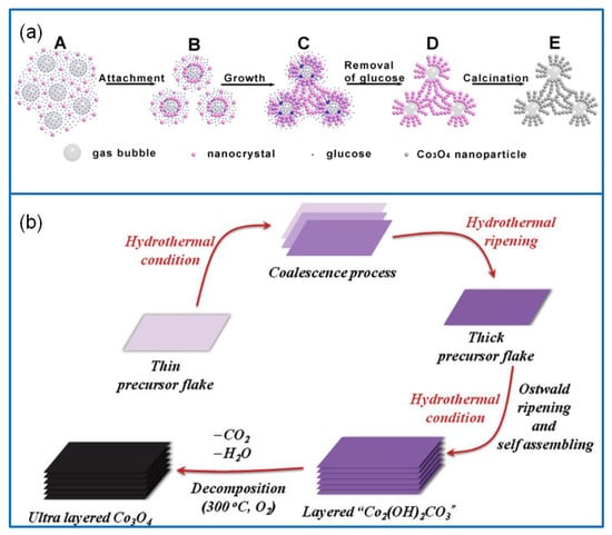 (a) Schematic illustration of preparing hollow structure Co3O4 via the direct precipitation method [54]. (b) Schematic illustration of preparing ultralayered Co3O4 via the homogeneous precipitation method [56].