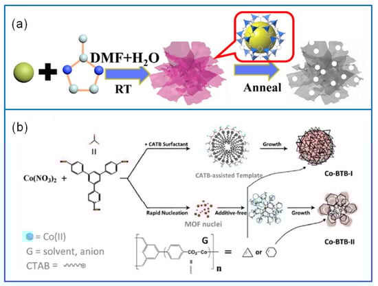 (a) Synthesis process of ultrathin Co3O4 via the template method [67]. (b) Schematic illustration of hollow spherical Co-BTB-I and the flower-like Co-BTB-II [68].