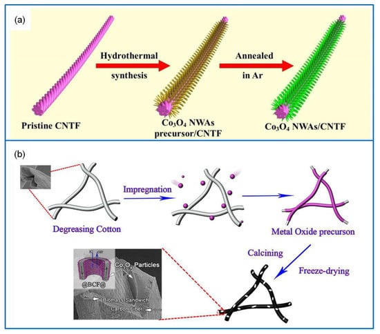 (a) Schematic illustration of synthesizing the 3D Co3O4 nanowire arrays directly on carbon fibers (CFs) [84]. (b) Fabrication of hierarchical Co3O4/biomass-derived CF (BCF) electrode material [85].