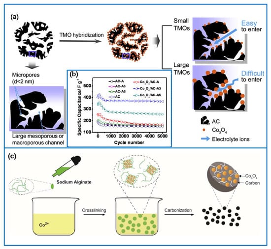 (a) Schematic of controlling the Co3O4 particles size. (b) The cycling life performance of AC- and Co3O4/AC-based electrodes at 5 A·g−1 [91]. (c) Synthesis process of the Co3O4/AC electrode materials [92].
