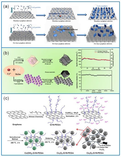 (a) Schematic illustration of synthesizing Co3O4/graphene@Ni electrode materials via the in situ synthesis method [106]. (b) Schematic route to prepare the Co3O4/rGO electrode composites [107]. (c) Modifying process of Co3O4-G > N electrode material by mPEG [108].