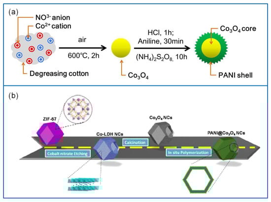 (a) Preparation of core–shell structured Co3O4/ polyaniline (PANI) electrode material via the in situ polymerization method [113]. (b) Schematic illustration of synthesizing hierarchically hollow Co3O4/PANI electrode material via the in situ polymerization route [114].