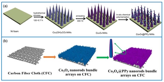 (a) Schematic illustration of preparing the hierarchical Co3O4/polypyrrole (PPy) core–shell composite nanowires [118]. (b) Fabrication of a flexible, high-performance, and tailorable nanorod Co3O4/PPy electrode [120].