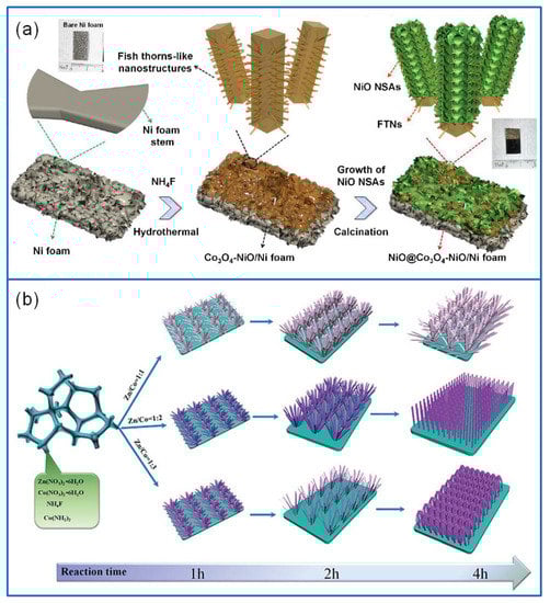 (a) Schematic illustration of forming NiO/Co3O4/NiO core–shell-like electrode material [131]. (b) Schematic route to synthesize hierarchical flower-like Co3O4/ZnO nanobundles [132].