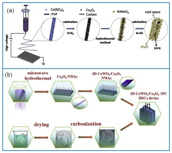 (a) Schematic illustration of preparing the Co3O4/NiMoO4 electrode materials [151]. (b) Fabrication of 3D heterostructure CoWO4/Co3O4//porous carbon SC device via the microwave hydrothermal method [152].