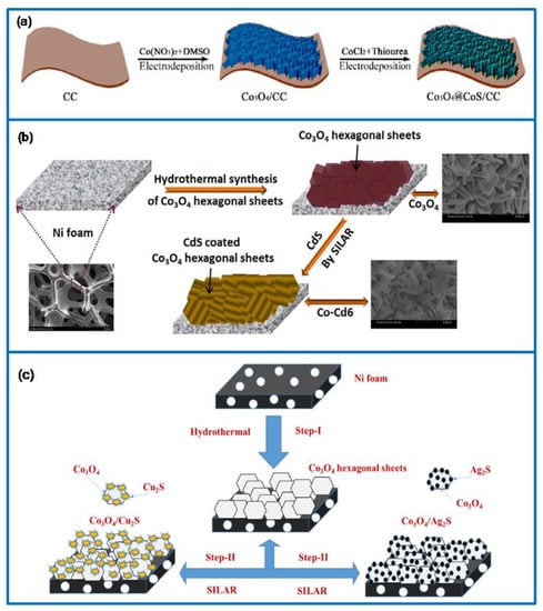 (a) Synthesis process of Co3O4/CoS nanosheet arrays on CC [166]. (b) Schematic illustration of preparing Co3O4/CdS on nickel foam (NF) [169]. (c) Schematic route to synthesize 3D Co3O4/Cu2S and Co3O4/Ag2S electrode materials [170].