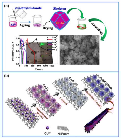 (a) Schematic route to synthesize the hollow polyhedral network-like Co3O4/NiCo2O4/ZnCo2O4 composite [177]. (b) Fabrication of the heterostructural Co3O4/C/MnO2 electrode material [178].