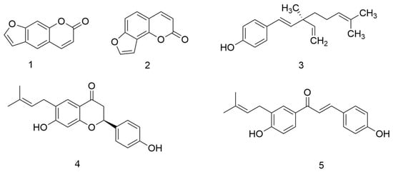 The structure of effective components of Psoralea corylifolia L. Compounds depicted above include (1) psoralen, (2) isopsoralen, (3) bakuchiol, (4) bavachin, and (5) isobavachalcone.
