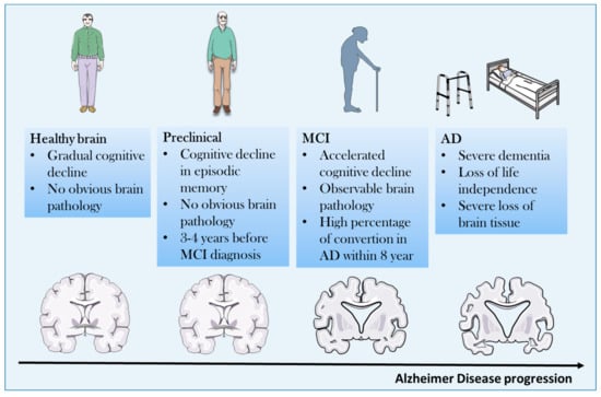 AD usually appears in a subacute manner in the preclinical phase characterized by reduced memory, cognition, and multiple personality changes. The course of the disease is usually progressive over a different period of time ranging from mild cognitive impairment to overt dementia that leads to complete cognitive impairment and physical disability and death, due to immobility [4,5] (Figure 1).