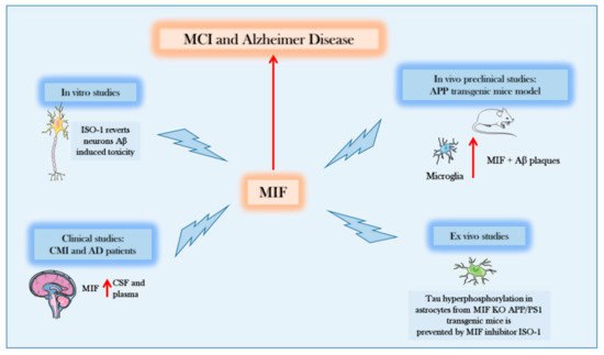 Evidences supporting the role of Macrophage Migration Inhibitory Factor (MIF) in Alzheimer′s disease (AD). In-vitro, in-vivo, and ex-vivo preclinical data, as well as data from AD and MCI patients show that MIF is increased during the course of the disease and that therapeutic intervention aimed at counteracting MIF function may exert beneficial effects on AD course. MCI: Mild Cognitive Impairment; Ab: Amyloid Beta; APP: Amyloid Precursor Protein; PS1: Presenilin 1; CSF: CerebroSpinal fluid; KO: Knockout; ISO-1: 4,5-Dihydro-3-(4-hydroxyphenyl)-5-isoxazoleacetic acid methyl ester.