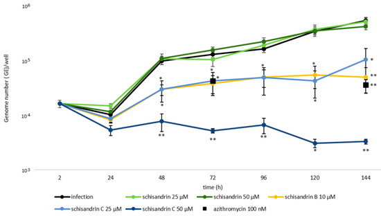 As shown in Figure 2, 10 μM schisandrin B and 25 μM schisandrin C were as effective as 100 nM azithromycin in reducing C. pneumoniae genome numbers at 72 h and 144 h after infection. At 50 μM, schisandrin C was superior to all other samples assayed for C. pneumoniae genome number reduction and showed a statistically significant difference to azithromycin in this respect. It yielded 95% reduction in bacterial genome numbers at 72 h and 99% reduction at 144 h, respectively.