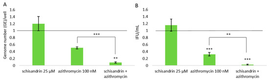 Impact of the concomitant administration of schisandrin (25 μM) and azithromycin (100 nM) on C. pneumoniae genome numbers (A) and EB progeny production (B). Data are normalized on the non-treated infection control and shown as a mean ± SEM (n ≥ 4) statistical significance is presented as marks of p-values: <0.01: **; <0.001: ***. Abbreviations: IFU = inclusion forming unit.