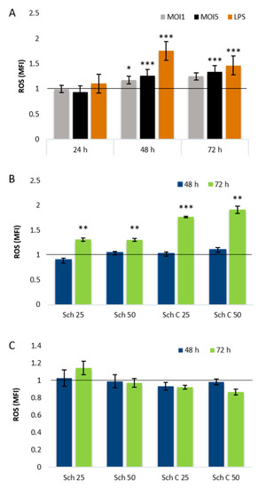 As the dibenzocyclooctadiene lignans are known for their redox activities and changes in cellular redox status have also been linked to bacterial persistence, we addressed the differential effects of schisandrin and schisandrin C on C. pneumoniae infection by studying changes in cellular redox status. As shown in Figure 4A, both multiplicity of infection (MOI) 1 and MOI5 C. pneumoniae infections of THP-1 macrophages elevated the ROS production of the cells statistically significantly at 48 h post infection. After 72 h infection ROS levels were elevated in MOI5-infected samples. When THP-1 macrophages were treated with schisandrin and schisandrin C, no differences in basal ROS levels were observed after 4–48 h exposure. After 72 h schisandrin and schisandrin C elevated ROS levels at both 25 μM and 50 μM concentration (Figure 4B). The concomitant administration of schisandrin and schisandrin C with MOI5 C. pneumoniae infection did not change the detected ROS levels compared to a vehicle-treated infection control (Figure 4C).