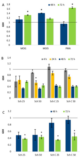 Consistent with earlier findings [37,38], we observed time-dependent fluctuation of GSH pools after chlamydial infection, which can be considered a homeostatic response of the host to the infection-induced increase in ROS levels. Our replication results show that despite the elevated ROS levels (Figure 4A) and altering GSH levels (Figure 5A) during infection, a significant fraction of the bacteria maintains an actively replicating phenotype. Thus, in contrast to murine macrophages [39,40] the oxidative environment seems not to result in purely persistent infection phenotype in human-derived THP-1 macrophages.