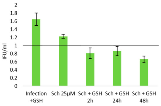 The impact of glutathione supplementation on schisandrin-induced changes in C. pneumoniae elementary body (EB) production. Data are normalized to the non-treated infection control and shown as a mean ± SEM (n = 4). Abbreviations: Sch = schisandrin.