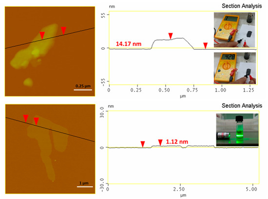 An Atomic Force Microscopy (AFM) study (Figure 2, top) of the synthetic graphite revealed the formation of graphite plates with a thickness of between 15–20 nm and lateral size in the range of 2–5 μm (e.g., thick micron-sized plates). The thickness of the plates exceeded the value of 5–10 nm for graphene nanosheets, hence pointing to multilayer graphite. In a practical use, we made a conductive ink by simply mixing by hand a small amount of graphite powder with water glass (sodium silicate aqueous solution) as a binder. The ink was spread on a paper, leaving behind a flexible conductive trace after drying (Figure 2, top: inset). In another example, we produced graphene using the liquid-phase exfoliation technique [3]. To this aim, 0.1 g of synthetic graphite was suspended by 3 h under sonication (130 W) in 25 mL of dimethylformamide (DMF) in a sealed glass vial. The suspension was left at rest for three days in order to settle down any solid particulates, and the supernatant was collected as a clear colloid giving a strong Tyndall effect using a green laser pointer (Figure 2, bottom: inset). According to the AFM, the colloid contained micron-sized thin sheets with a thickness of 1–1.3 nm (Figure 2, bottom). Such values are consistent with graphene [18] (graphene ISO standard: ISO/TS 80004-13:2017). A statistical analysis of graphite and graphene thicknesses based on an AFM is included in the supporting information section (Figure S4). Last, for reasons of completeness we have also included some representative TEM images of graphite and graphene as supporting information (Figure S5).