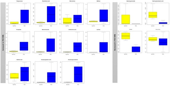 Box and Whisker plot of the VIP metabolites in buffalo milk samples. Boxes represent non-PDO (yellow) and PDO (blue) milk samples. The vertical axis reports the log of the gas chromatography mass spectrometry values of the normalized area of each metabolite.