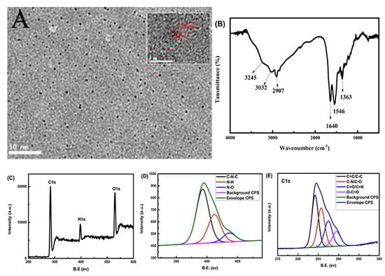 (A) TEM image of nitrogen-doped carbon dots (N-CQDs) (insert: local lattice amplification of single N-CQDs); (B) the FT-IR spectrum of N-CQDs; (C) the full-scale X-ray photoelectron spectroscopy (XPS) spectrum of N-CQDs; (D) N1s and (E) C1s spectra of N-CQDs.