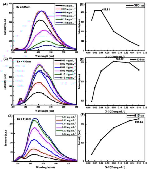 (A,C,E) Emission spectra excited with 365 nm, 430 nm and 515 nm light as a function of N-CQDs concentration, respectively and (B,D,F) fluorescence intensity of N-CQDs with different excitation wavelengths at 365 nm, 430 nm and 515 nm, respectively.
