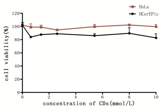 The labeling of cells is of great significance in the field of biomedical for understanding their division, migration and the formation process and function of organelles. Thus, there are high requirements for the biocompatibility of cell dyes. For this reason, we tested the toxicity of N-CQDs on cells using CCK-8 assay. As shown in Figure 4, the result showed that no matter for normal cells or cancer cells, N-CQDs always possessed low cytotoxicity and good biocompatibility. It is proved that the as-prepared N-CQDs could be used for the labeling of living cells and dynamic study of physiological processes.