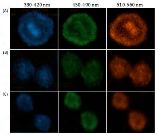 As shown in Figure 7, asynchronous cell imaging shows mitotic cells stained by DSF visualizing chromosome aggregation through progression of mitosis. Further, N-CQDs Laser confocal microscope imaging also visualizes characteristic structural changes in cells as cells progress through the cell cycle. As shown in the fluorescence picture (Figure 7A) of a single cell, when asynchronous cells are imaged, the majority of labeling cells are in interphase, whereas cells undergoing mitotic phases were also obviously observed. As shown in higher resolution micrographs (Figure 6) of a single cell, when asynchronous cells were imaged, the majority of labeled cells were in interphase but cells undergoing mitotic phases were also clearly observed. The internalized nitrogen-doped carbon dots were enriched in the nucleus and combined with chromatin, light intensity varied with the concentration of chromatin as well.