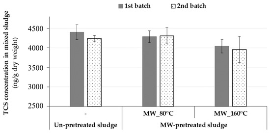 The initial studies focused on assessing MW pretreatment impact on TCS in undigested municipal sludge by applying batch heating experiments. Two independent batches of samples collected from the Westside Regional WWTP in September were analyzed in un-pretreated and MW-pretreated mixed sludges in order to evaluate the effectiveness of MW pretreatment on the reduction of TCS sludge concentrations (Figure 2). Initially, TCS was measured at an average concentration of 4320 ± 225 ng/g-dry in un-pretreated (raw) mixed sludge. Then, MW pretreatment was applied at different temperatures (80 or 160 °C); however, no discernible changes were observed in TCS sludge concentrations. After MW pretreatment, the levels of TCS in MW-pretreated mixed sludge samples were not statistically different from un-pretreated sludge according to a One-Way ANOVA (p-value = 0.178 > 0.05). This result might be explained by the quantum energy of MW irradiation operated at a frequency of 2450 MHz. As this activation energy (1.0 × 10−5 eV) is too low, MW irradiation does not provide sufficient energy to break typical chemical bonds (such as C–C: 3.61 eV, C–O: 3.74 eV, C–H: 4.28, or OH: 4.80 eV) commonly found in organic compounds [52], although it has been proven to achieve disintegration of extracellular polymeric network and pathogen destruction [46]. Based on energies of the chemical bonds, MW may not able to disrupt the specific bonds of TCS as it is a halogenated aromatic hydrocarbon. This finding was in agreement with the results of Armstrong et al. [18] who reported that TCS and some of its transformation products (methyl-TCS, and 2,4-dichlorophenol) in mixed sludge were not impacted by Cambi Hydrolysis Process™ at temperatures of 150–180 °C for 30 min and at pressures of 0.37–0.95 MPa. In their study, the average concentrations of TCS, methyl-TCS, and 2,4-dichlorophenol before and after thermal hydrolysis ranged from 7489 to 6884 ng/g-dry, 280 to 248 ng/g-dry, and 283 to 204 ng/g-dry, respectively. On the other hand, Ross et al. [53] indicated that TCS was removed (<100 ng/g-dry) from biosolids (a mixture of WAS and anaerobically digested primary solids) when pyrolysis was performed at a temperature of 300 °C during the batch pyrolysis experiments. The authors also indicated that the pyrolysis reaction time required in order to eliminate TCS from biosolids was less than 5 min at 500 °C. Considering the results from this MW study, as well as other studies using conventional heating, it seems that higher temperatures (i.e., >300 °C, higher than TCS’s boiling point given in Table 1) are needed to observe statistically significant changes on TCS after heating.